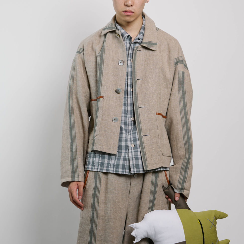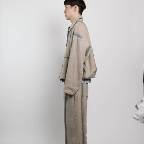 フロント・バックに縦方向の柄が通るデザインは、まるで昔の穀物袋をそのまま仕立て直したかのような空気感を出したかったので脇にシームを設けない設計にしました。