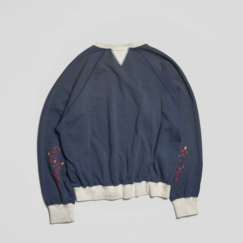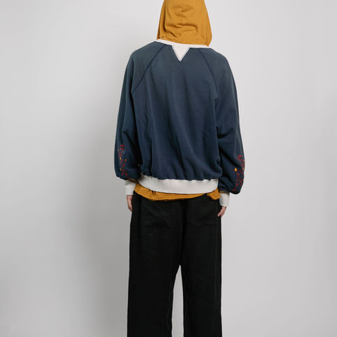 古着スウェットの構造を踏まえつつ、春夏らしく軽めのウエイトの裏毛を使用し、首元の断ち切りやゆるやかな丸みで、着慣れたような抜け感を加えた一着です。